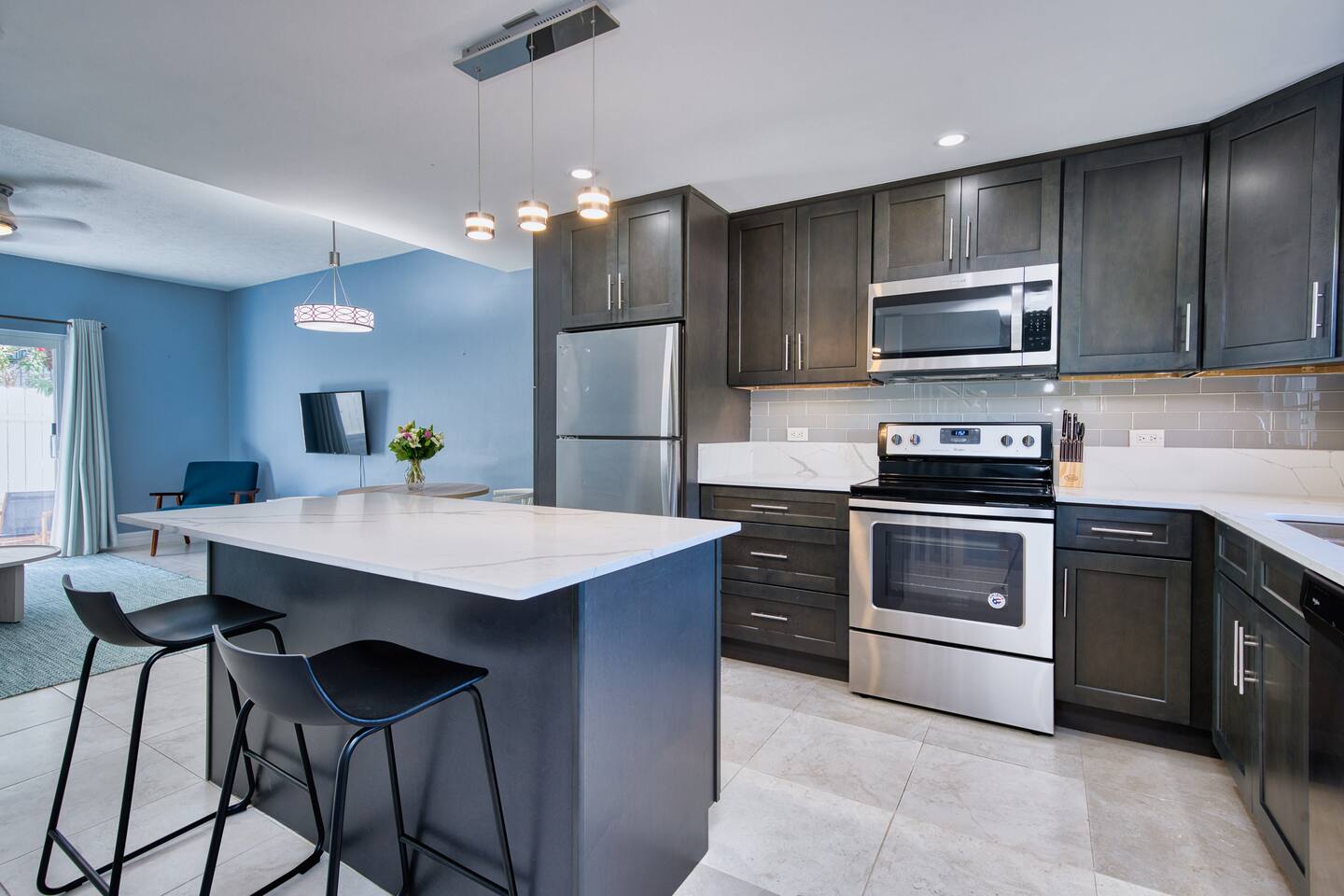 We were really glad that we extended our stay for another week at Kevin’s place. He was very kind, responded promptly, and the home was clean and private. We had great proximity to 7 mile beach and the grocery store was less than a mile away. Both bathrooms are located upstairs. There was a nice, small and private back patio perfect for when it was too windy at the beach. I was pleased to find available Netflix for the unit on both TVs.